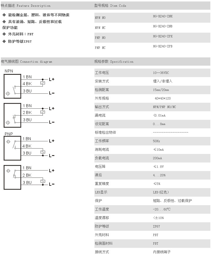 電容式接近傳感器 HG-RZ40-ZNK,HG-RZ40-ZNB,HG-RZ40-ZPK,HG-RZ40-ZPB,