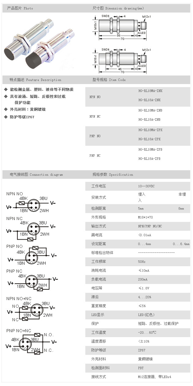 電容式接近傳感器 HG-RL18MA-ZNK,HG-RL18A-ZNK,HG-RL18MA-ZNB,HG-RL18A-ZNB,