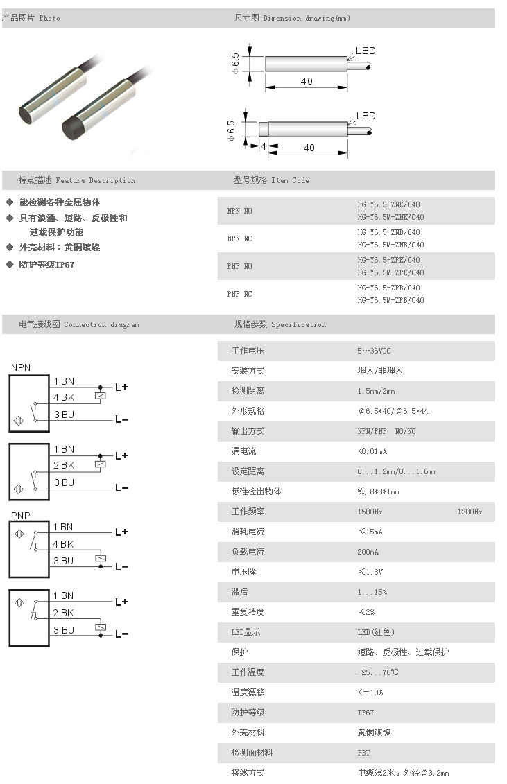 超小型接近開(kāi)關(guān) HG-Y6.5-ZNK/C40,HG-Y6.5M-ZNK/C40,HG-Y6.5-ZNB/C40,HG-Y6.5M-ZNB/C40,HG-Y6.5-ZPK/C40,HG-Y6.5M-Z