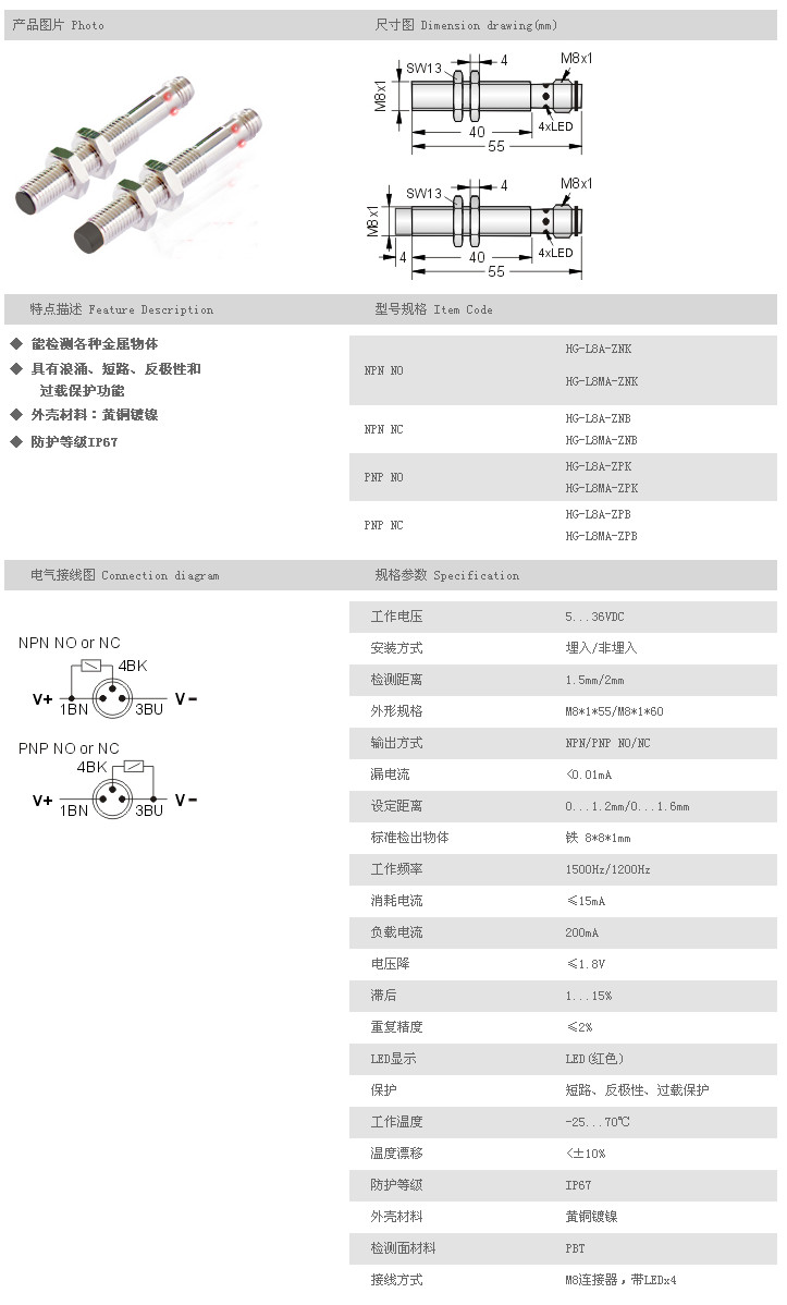 L8A圓柱型接近開關 HG-L8A-ZNK,HG-L8MA-ZNK,HG-L8A-ZNB,HG-L8MA-ZNB,HG-L8A-ZPK,HG-L8MA-ZPK,HG-L8A-ZPB,HG-L8MA-Z |