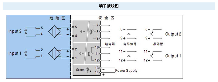 接收來自危險區(qū)域的開關(guān)或接近開關(guān)信號,通過安全柵隔離,以繼電器觸點(電平信號或晶體管)輸出方式傳送至安全區(qū)的控制系統(tǒng)或其它組合儀表。