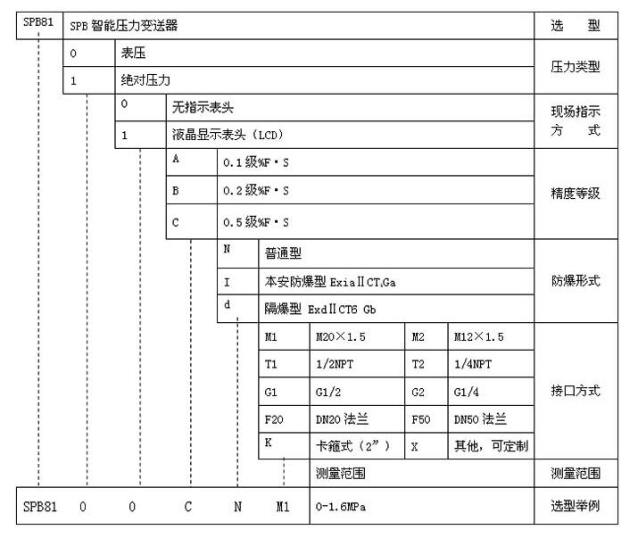 如上選型SPB8100CNM1 0-1.6MPa代表:智能型壓力變送器,不帶表頭顯示,安裝螺紋為M20*1.5,精度0.5級,普通型,量程為0-1.6MPa。