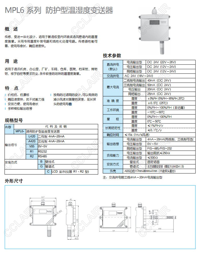 MPL6-L420B,MPL6-A420G,MPL6-V05B,MPL6-R1BC,MPL6-R1GC,MPL6-R2BC,MPL6,防護(hù)型溫濕度變送器