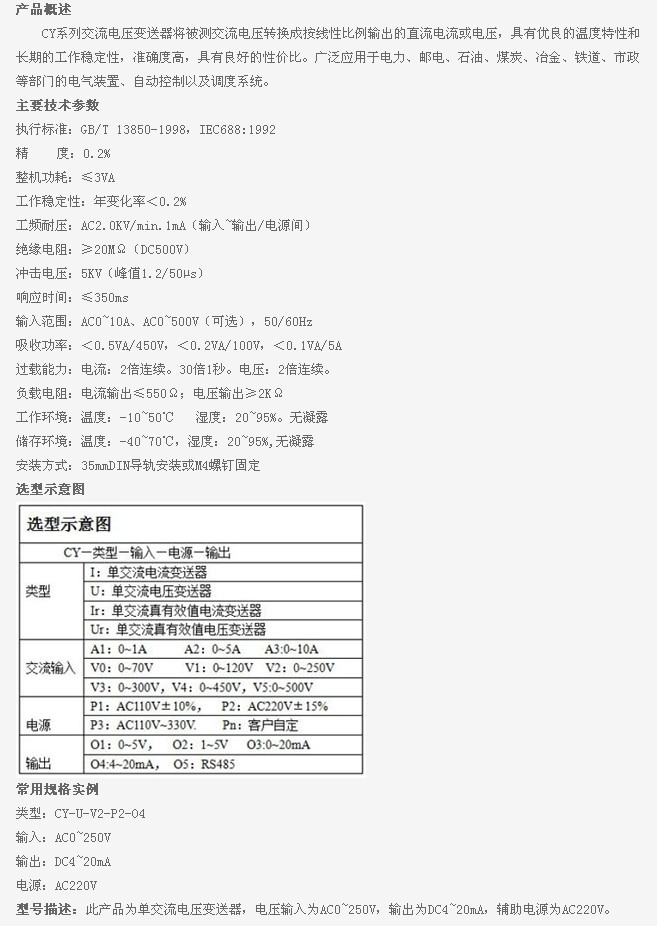 CY-U-A1-P1-O1,CY-U-V0-P1-O2,CY-Ur-V5-Pn-O5,CY-U-V2-P2-O4,CY,交流電壓變送器