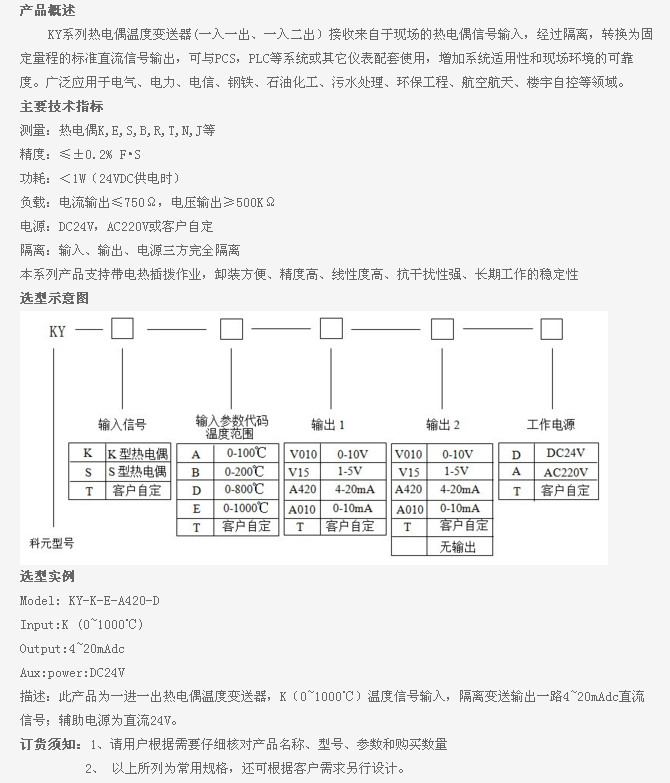 型號(hào): KY-K-A-V010-D,KY-K-B-V010-A,KY-K-D-V15-D,KY-T-A-V15-A,KY-K-E-A420-D,KY,熱電偶溫度變送器