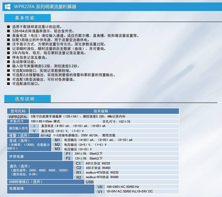 WPR22FA-I,WPR22FA-V,明渠流量積算器