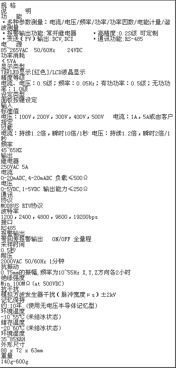 SWP-EM系列三相電力儀表采用先進(jìn)的交流采樣技術(shù),能分別測量電網(wǎng)中的電流,電壓,頻率,功率,功率因數(shù)等電參數(shù),可通過面板薄膜開關(guān)切換顯示內(nèi)容及設(shè)置內(nèi)部參數(shù)。可用RS-485通訊接口與微機(jī)實(shí)現(xiàn)通訊,極大地方便了用電自動(dòng)化管理;也可將電量信號轉(zhuǎn)換成標(biāo)準(zhǔn)的直流模擬信號輸出;帶2路繼電器報(bào)警輸出。采用標(biāo)準(zhǔn)導(dǎo)軌式安裝,節(jié)約空間。