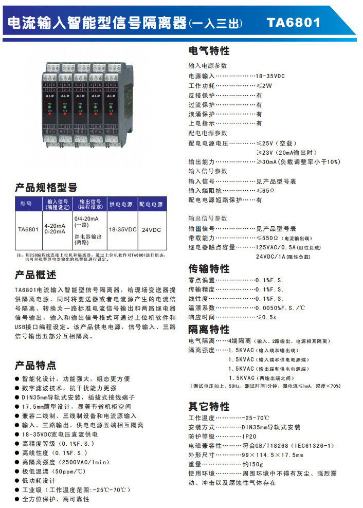 TA6801,電流輸入智能型信號(hào)隔離器(一入三出)