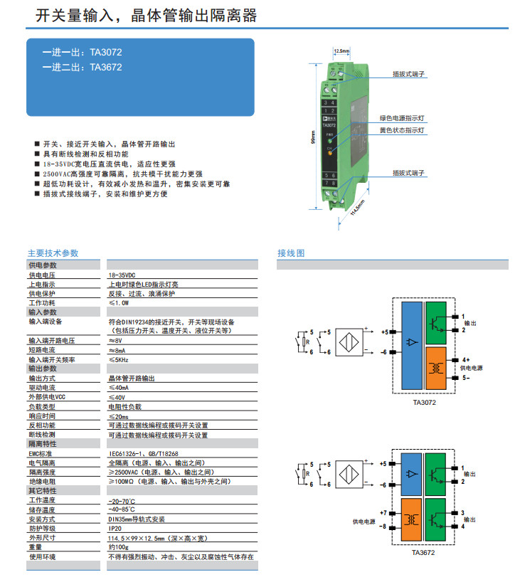 TA3072,TA3672,開關(guān)量輸入,晶體管輸出隔離器