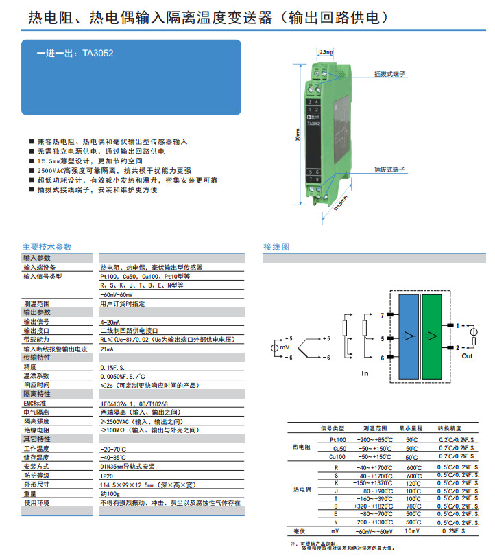TA3052,熱電阻、熱電偶輸入隔離溫度變送器(輸出回路供電)