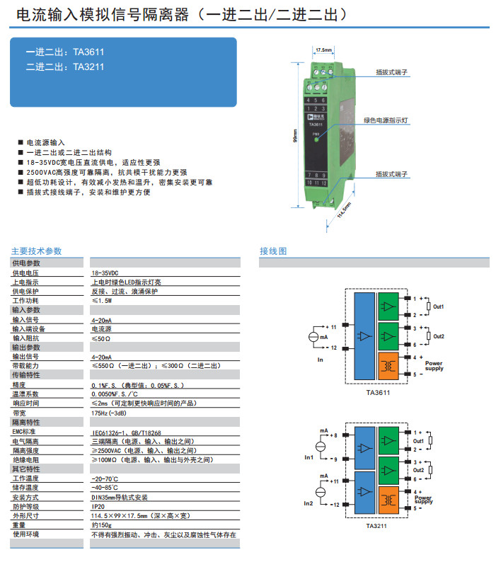 TA3611,TA3211,電流輸入模擬信號隔離器