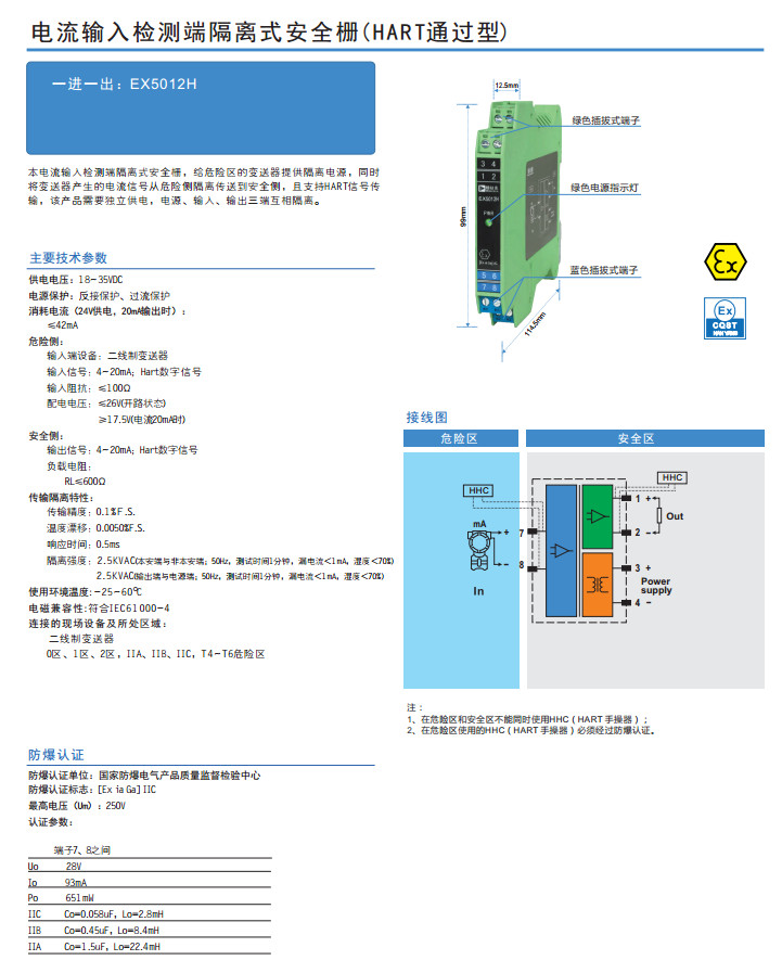 EX5012H,電流輸入檢測(cè)端隔離式安全柵(HART通過型)