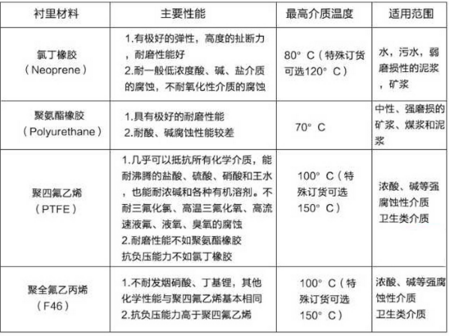 | 襯里材質(zhì) | 氯丁橡膠、聚氨酯、聚四氟乙烯 | |||||