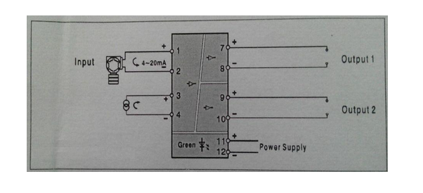給二線制變送器提供隔離的直流電源,并檢測來自變送器的4~20mA電流信號,經(jīng)過隔離、抗干擾抑制等處理后。向控制系統(tǒng)或其他單元組合儀表輸出直流電流或電壓信號。該隔離配電器采用直流電源供電,供電電源—輸入—輸出之間相互隔離。