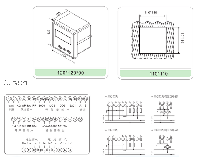 測(cè)量:三相電壓、電流、有功功率、無(wú)功功率、功率因數(shù)、頻率、有功電能、無(wú)功電能。