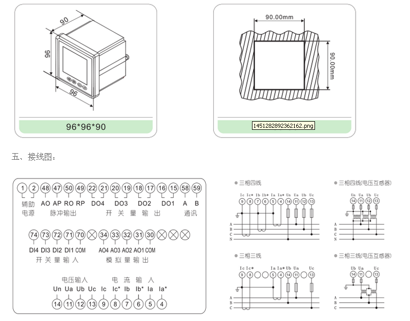 輸出: 2路開關(guān)量輸出,1路模擬量輸出,2路電能脈沖輸出(脈沖常數(shù)3200imp/kwh)
