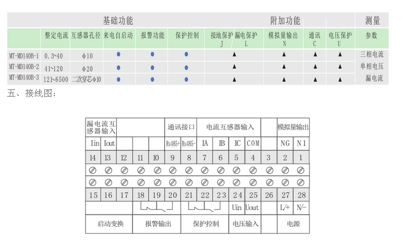該產(chǎn)品具有過壓保護、欠壓保護、斷相保護、三相不平衡保護、堵轉(zhuǎn)保護、短路保護、欠流保護、過流保護、來電自啟動、報警功能、保護控制、接地及漏電保護、模擬量輸出、通訊功能、電壓保護及參數(shù)測量。
