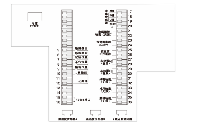 4、高壓帶電指示器的各輸入端分別接入對應的高壓帶電傳感器,高壓帶 電指示燈亮,閉鎖有效,閉鎖燈滅;高壓斷開后,帶電指示燈滅,閉鎖接觸,指示燈亮。在MT-ZT140系列產(chǎn)品中,三相(A、B、C)任意一相帶電對應的指示 燈亮,閉鎖觸點有效。