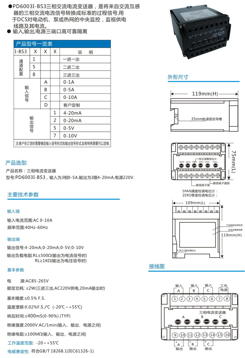PD6003I-BS31A,PD6003I-BS35B,PD6003I-BS38C,PD6003I-BS38D,PD6003I-BS3,三相交流電流變送器