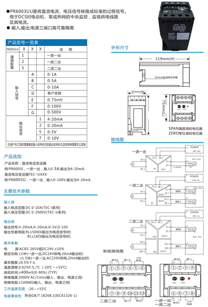 PR6003I1A1,PR6003I2A5,PR6003I5F7,PR6003U1C2,PR6003U5G7,PR6003I/U,單相直流電流電壓變送器