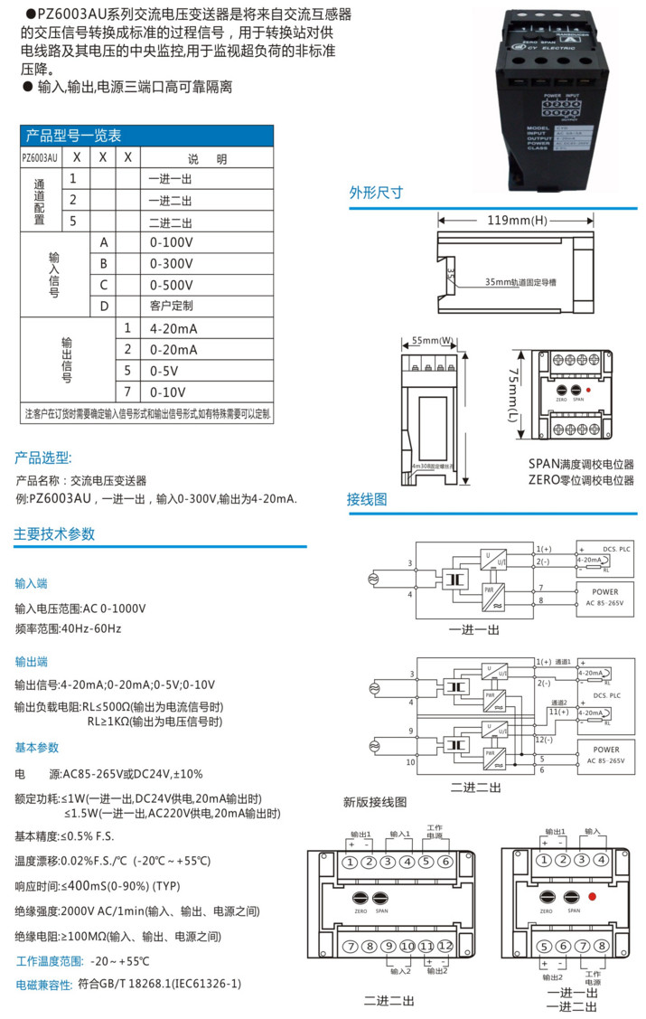 PZ6003AU1A1,PZ6003AU1B2,PZ6003AU1C5,PZ6003AU2D7,PZ6003AU5A2,PZ6003AU,單相電壓變送器