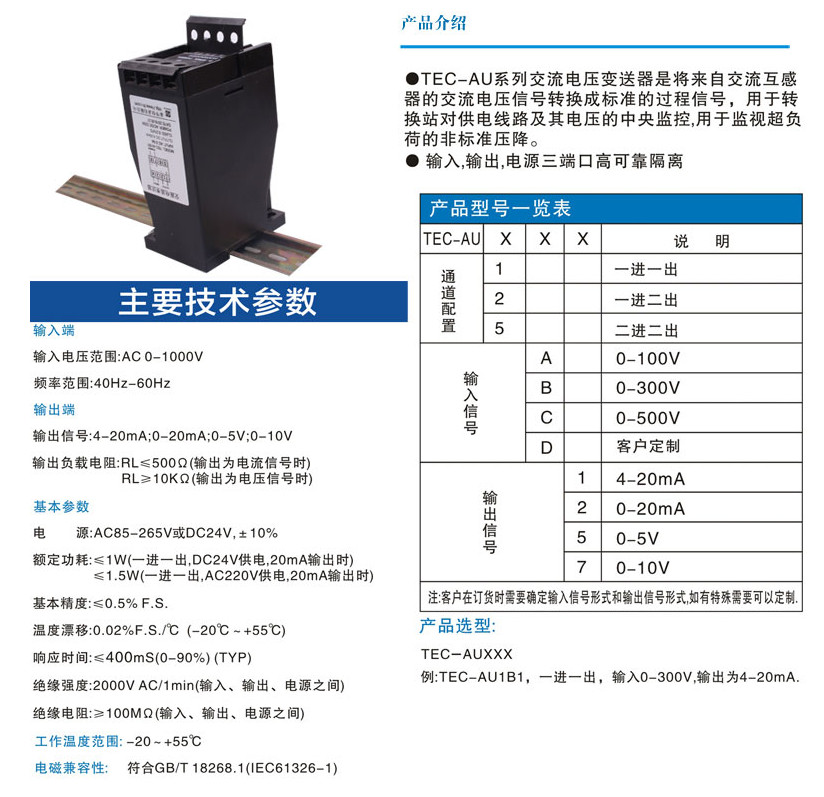 TEC-AU1A1,TEC-AU1C2,TEC-AU2B1,TEC-AU2D2,TEC-AU5A5,TEC-AU5D5,TEC-AU,交流電壓變送器