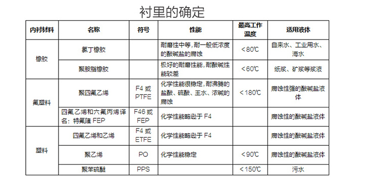 襯里材料:氯丁橡膠(CR),聚全氟乙丙烯F46(FEP),聚四氟乙烯(PTFE),聚氨酯橡膠(PU),