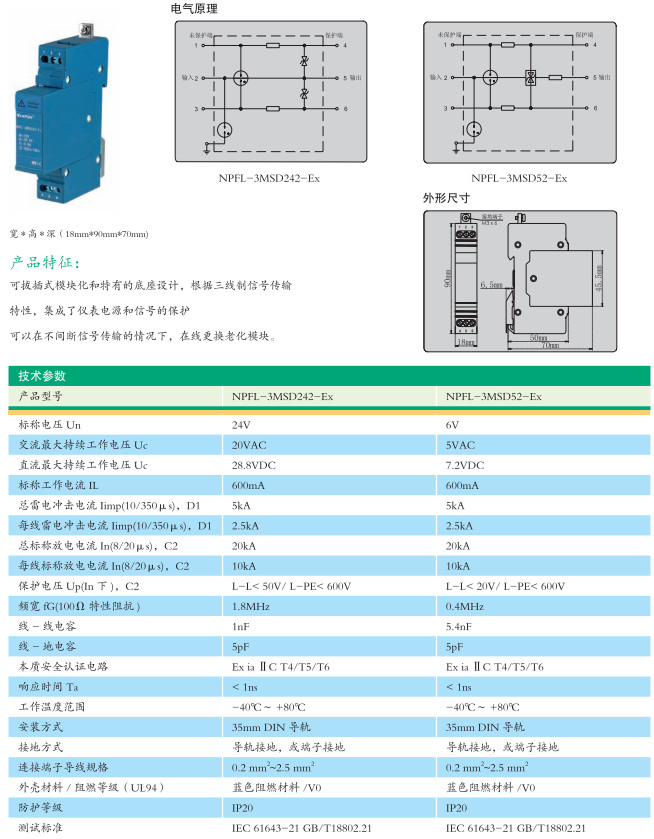 NPFL-3MSD52-Ex,NPFL-3MSD242-Ex,三線制本安型信號(hào)浪涌保護(hù)器(浮地)