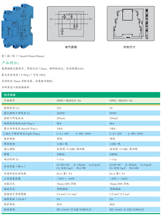 NPFL-3KSD241-Ex,NPFL-3KSD51-Ex,二線制本安型信號(hào)浪涌保護(hù)器(浮地)