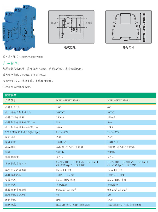 NPFL-3KSD52-Ex,NPFL-3KSD242-Ex,三線制本安型信號浪涌保護(hù)器(浮地)