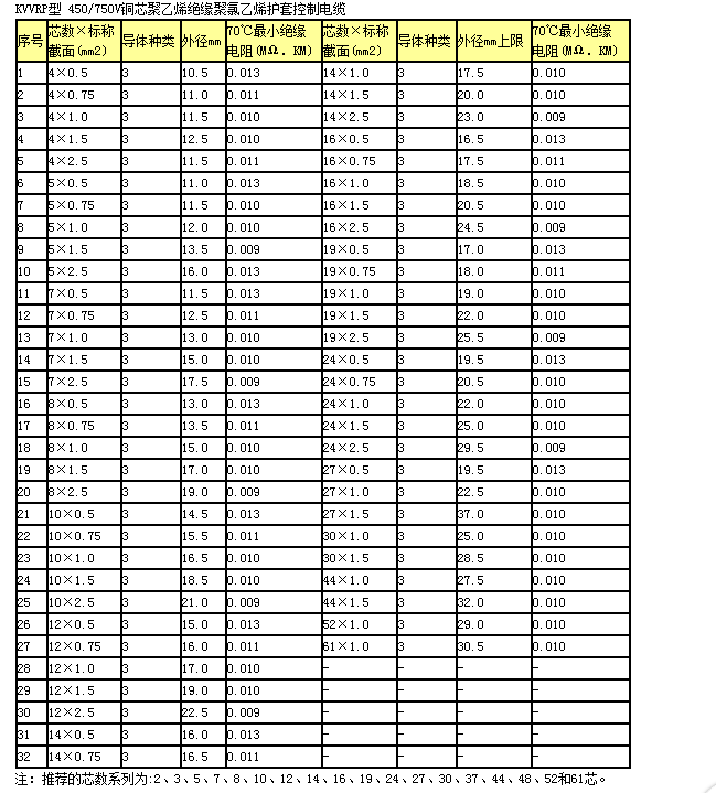 注:推薦的芯數(shù)系列為:2、3、5、7、8、10、12、14、16、19、24、27、30、37、44、48、52和61芯。