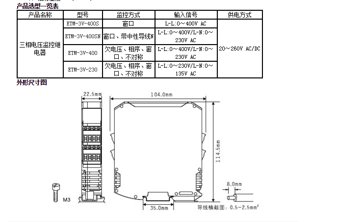 ETM-3V-230、ETM-3V-400、ETM-3V-400、ETM-3V-400三相電壓監(jiān)控,依據(jù)用戶設(shè)定值實(shí)現(xiàn)對(duì)三相電的欠壓、過壓、不平衡度以及相序故障監(jiān)控。該模塊具有雙刀雙擲繼電器輸出。產(chǎn)品采用20~260V a.c./d.c.供電。電源、輸入和輸出三隔離。