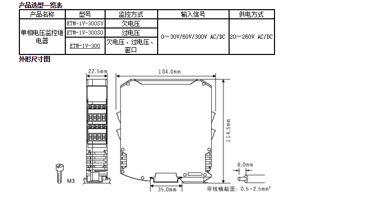 ETM-1V-300、ETM-1V-300SO、ETM-1V-300SU單相電壓監(jiān)控,依據(jù)用戶設定值實現(xiàn)對單相電的欠壓、過壓故障的監(jiān)控。該模塊具有雙刀雙擲繼電器輸出。產品采用20~260V a.c./d.c.供電。電源、輸入和輸出三隔離。