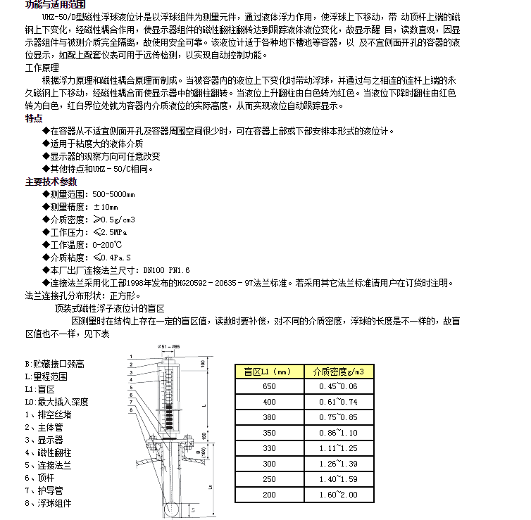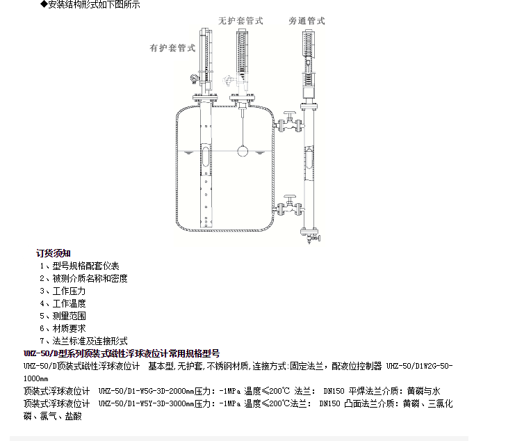 UHZ-50/D1,UHZ-50/D2,UHZ-50/D1-E2T-10-1500-0.8-0-0.8,頂裝式磁性浮球液位計