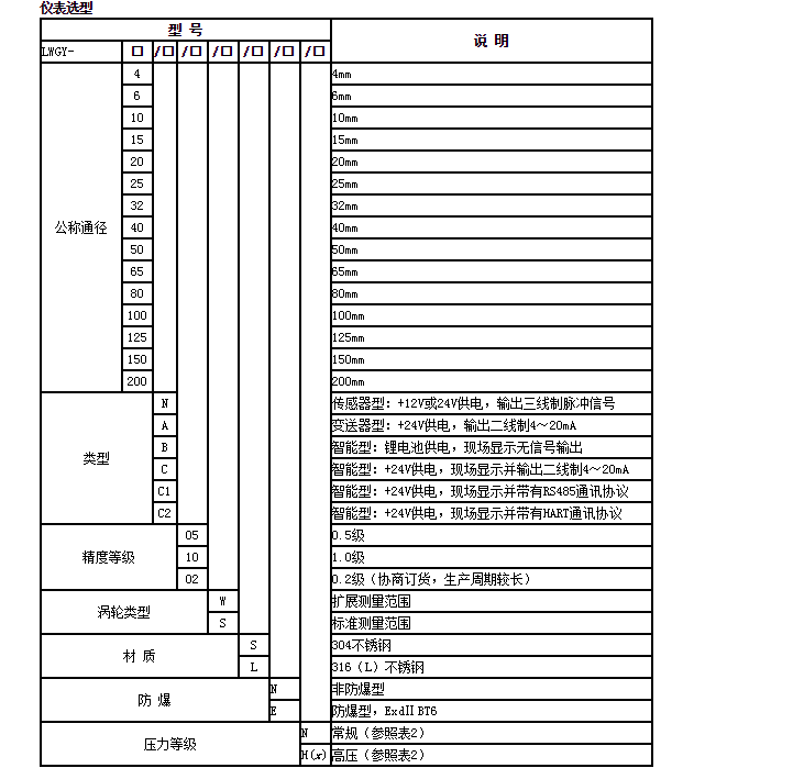 | 儀表口徑及連接方式 | 4、6、10、15、20、25、32、40采用螺紋連接 (15、20、25、32、40)50、65、80、100、125、150、200采用法蘭連接 |