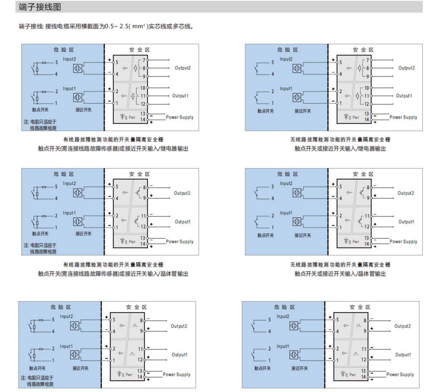 (說明: 當(dāng)用到線路檢測功能時,如果需要使用機械觸點開關(guān)作為輸入設(shè)備,必須在輸入回路中連接線路故障傳感器,以避免開關(guān)量隔離安全柵將機械觸點開關(guān)正常的通斷誤當(dāng)做輸入回路的斷路或短路故障。)