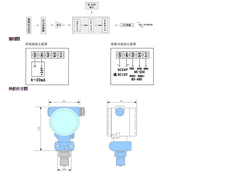儀表通過壓力傳感器把壓力信號變?yōu)殡娦盘?,再由前置放大器把此電信號放大濾波,送往CPU的A/D轉(zhuǎn)換模塊進行模擬量到數(shù)字量的變換。最后