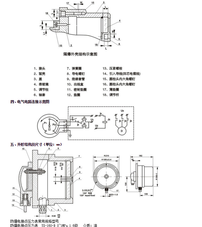 防爆電接點壓力表系按GB3836.183《爆炸性環(huán)境用防爆電氣設備通用要求》和GB3836.28爆炸性環(huán)境用防爆電氣設備 隔爆型電氣設備“d”》的有關規(guī)定相關標準進行設計,并經由國家指定的檢驗機構所審批的圖樣和技術文件進行制造。