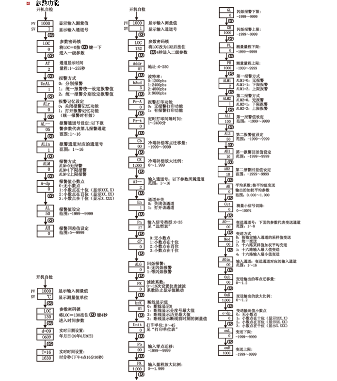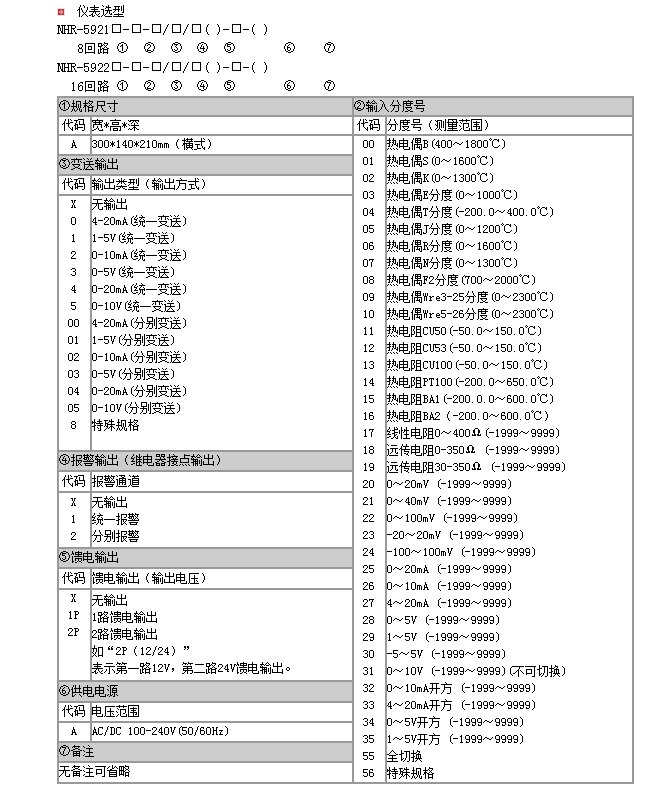 NHR-5920系列多回路臺式打印控制儀采用先進(jìn)的微處理器進(jìn)行智能控制,集打印、控制及測量顯示于一體,本機(jī)包含多路測量顯示控制儀的全部功能,增加了現(xiàn)場打印記錄功能,可以自動定時打印或手動即時打印各通道當(dāng)前測量值,適用于需在要進(jìn)行多測量點巡回檢測的系統(tǒng)。 雙屏LED數(shù)碼顯示,PV顯示測量值,SV顯示當(dāng)前通道號。 可巡回檢測8~16路測量信號,各輸入通道測量信號互不干擾。 具備36種信號輸入功能,各通道可同時輸入不同的信號類型;0.2%級測量精度。 報警方式可選擇8路或16路“統(tǒng)一報警輸出”、“16路分別報警輸出”,“統(tǒng)一報警輸出”時通過參數(shù)設(shè)置可選擇帶記憶報警和不帶記憶報警功能,儀表面板帶LED報警指示燈。 變送輸出方式可以選擇“統(tǒng)一變送輸出”、“8路分別變送輸出”,“按指定輸入通道的采樣值變送”、統(tǒng)一變送、“16路采樣值加權(quán)平均變送”、“16路輸入最大值變送”、“16路輸入最小值變送”。 儀表數(shù)據(jù)刷新周期2秒/16路。 儀表帶RS232C打印功能,具有手動打印、定時打印、報警打印功能。 帶DC24V饋電輸出,為現(xiàn)場變送器配電。 輸入、輸出、電源、通訊相互之間采用光電隔離技術(shù)。 參數(shù)設(shè)定密碼鎖定,參數(shù)設(shè)置斷電永久保存,具有參數(shù)恢復(fù)出廠設(shè)定功能。