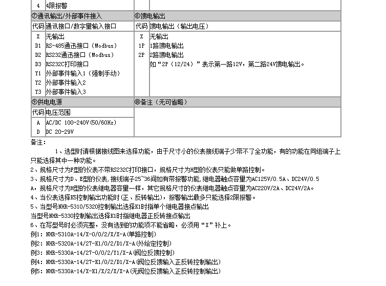 NHR-5300系列人工智能PID調(diào)節(jié)器采用微分先行的控制算法,帶有外給定和閥位控制功能??膳c各類傳感器、變送器配合使用,實現(xiàn)對溫度、壓力、液位、容量、速度等物理量的測量顯示,并配合各種執(zhí)行器對電加熱設(shè)備和電磁、電動閥進(jìn)行PID調(diào)節(jié)和控制、報警控制、數(shù)據(jù)采集等功能。 雙屏LED數(shù)碼顯示,且?guī)в泄庵M指示功能(0~100%)。 具備36種信號輸入功能,可任意選擇輸入信號類型;0.2%級測量精度。 具備“上下限報警”、“偏差報警”、“LBA報警”、“閃爍報警”等報警功能,帶LED報警燈指示。 可帶一路PID控制輸出和一路模擬量變送輸出,具有電流、電壓、SSR驅(qū)動、單/三相可控硅過零觸發(fā)、繼電器接點等輸出控制方式可選擇。 帶PID參數(shù)自整定功能,控制輸出手動/自動無擾切換功能,控制準(zhǔn)確且無超調(diào)。 支持RS485、RS232串行接口,采用標(biāo)準(zhǔn)MODBUS RTU通訊協(xié)議。 儀表可帶RS232C打印功能,具有手動打印、定時打印、報警打印等功能。 帶DC24V饋電輸出,為現(xiàn)場變送器配電。 輸入、輸出、電源、通訊相互之間采用光電隔離技術(shù)。 具備多種外形尺寸及樣式供用戶選擇。 參數(shù)設(shè)定密碼鎖定、參數(shù)設(shè)置斷電永久保存,具備參數(shù)恢復(fù)出廠設(shè)定功能。