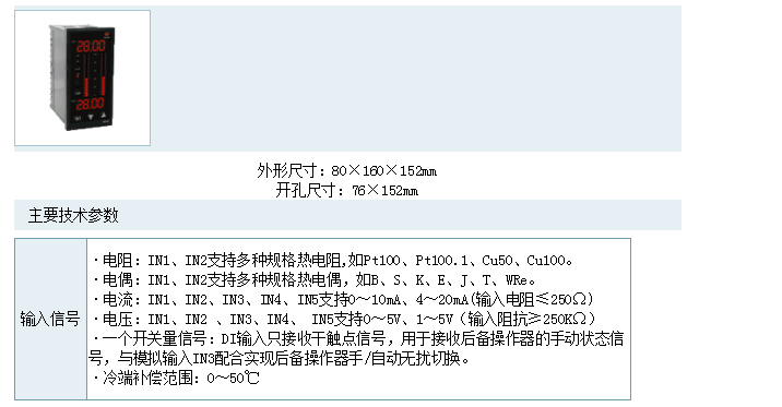 WP-KS805系列雙回路串級智能PID調(diào)節(jié)控制儀,具有5個模擬輸入(IN1-IN5)2個模擬輸出(OUT1、OUT2),一個開關(guān)量輸入DI,2個開關(guān)量輸出和豐富的控制算法,適用于鍋爐汽包水位三沖量控制或兩沖量控制并可帶汽包水位壓力補償功能適用于一般工業(yè)過程中溫度、壓力、液位、流量等各種過程參數(shù)的串級控制,前饋控制、雙路控制等,并可帶后備操作器,與后備控制器配套實現(xiàn)手動/自動無擾切換。