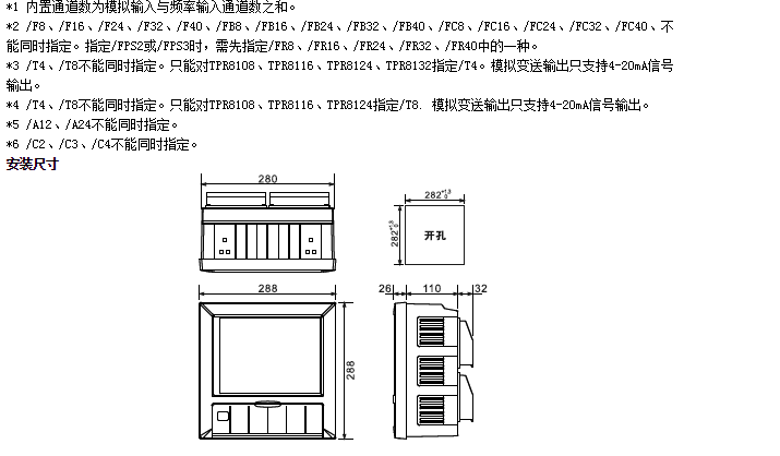 | ●報(bào)警輸出繼電器(/A12,/A24): 輸出點(diǎn)數(shù):從12、24點(diǎn)中選擇。 ●通信功能(/C2,/C3) 媒體:RS-232(/C2)或RS-485(/C3) 協(xié)議:Modbus-RTU(從機(jī))協(xié)議 通信速率:1200/2400/4800/9600/19200/38400/57600 ●打印功能(/C4) 打印機(jī):面板式微型打印機(jī)。 打印內(nèi)容:實(shí)時(shí)數(shù)據(jù)、歷史數(shù)據(jù)、累積報(bào)表。 打印方式:手工打印、定時(shí)打印。 ●模擬輸出(/T4,/T8) 信號(hào)類(lèi)型:4-20mA 輸出點(diǎn)數(shù):從4,8點(diǎn)中選擇。 輸出方式:測(cè)量通道的變送輸出。 最大負(fù)載:750Ω ●24VDC變送器電源輸出(TP8): 輸出點(diǎn)數(shù):8回路。 輸出電壓:24VDC。 額定輸出電流:4~20MADC。 最大輸出電流:65mAdc(過(guò)電流保護(hù)動(dòng)作電流:約90mA) |