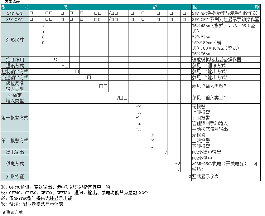 SWP-GFY系列數(shù)字/光柱顯示智能模擬輸出操作器接收從DCS系統(tǒng)或智能調節(jié)器來的0-10mA/4-20mA/0-5V/1-5V閥位給定輸出信號,再由伺服放大器去驅動電動調節(jié)閥門或由電氣轉換器和閥門定位器去驅動氣動薄膜閥,適合于作為DOS系統(tǒng)回路調節(jié)控制輸出和智能調節(jié)器控制輸出的后備操作器使用。