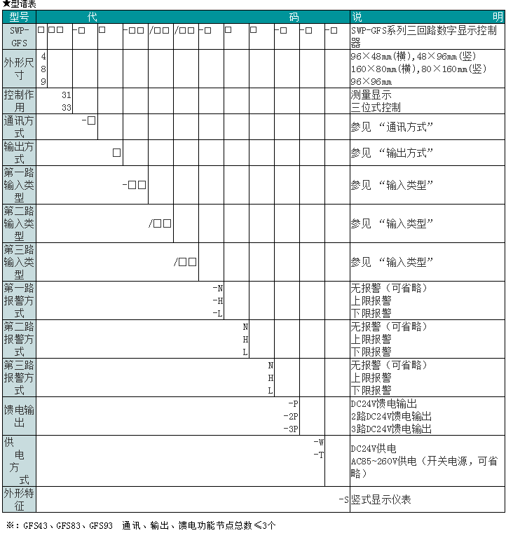SWP-GFS系列三回路數(shù)字顯示控制器可對溫度、壓力、液位、速度等測量信號進行數(shù)字量顯示控制(高亮度LED數(shù)碼顯示),三路測量同屏顯示,使測量值的顯示更為清晰直觀。