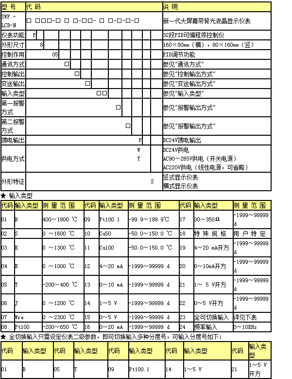 | 1、用戶依照儀表LCD顯示屏中文菜單提示,通過面板按鍵可完成輸入信號(hào)類型與分度號(hào)的自由切換,實(shí)現(xiàn)萬能輸入 |