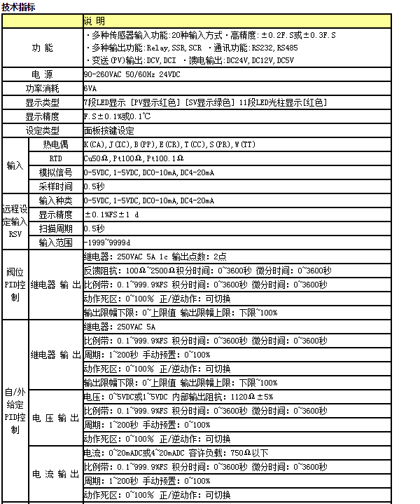 SWP-F系列人工智能調(diào)節(jié)器精度0.2%,采樣周期最短0.25秒,手/自動(dòng)切換,內(nèi)給定/外給定SV切換,可設(shè)定兩種PID調(diào)節(jié)模式:TYPEA、TYPEB。事件輸出最多2點(diǎn)(偏差、PV、︱偏差︱、SV、控制輸出、馬達(dá)反饋回路、控制回路診斷報(bào)警)。它可根據(jù)SV值范圍進(jìn)行PID參數(shù)切換。它還支持RS-232、RS485通訊兼容MODBUS協(xié)議。