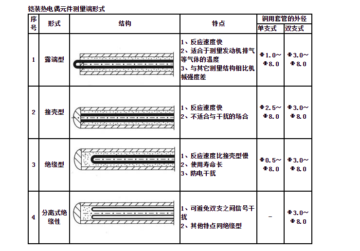 6、鎧裝熱電偶外徑尺寸范圍:鎧裝熱電偶外徑可提供Φ0.25~8Φmm,特殊要求的可以提供Φ12mm的產(chǎn)品
