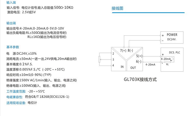 GL703K信號隔離調(diào)理器輸入范圍:0-500Ω 0-1KΩ、0-10KΩ、0-20KΩ等用戶特定規(guī)格