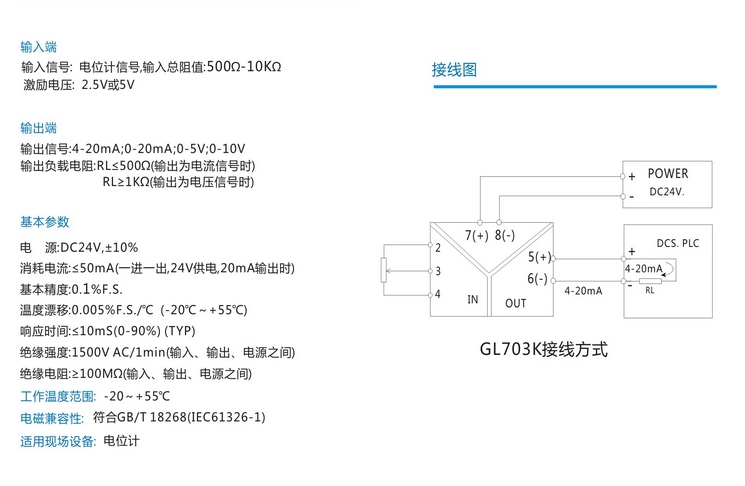 GL703K信號(hào)隔離調(diào)理器輸入范圍:0-500Ω 0-1KΩ、0-10KΩ、0-20KΩ等用戶特定規(guī)格