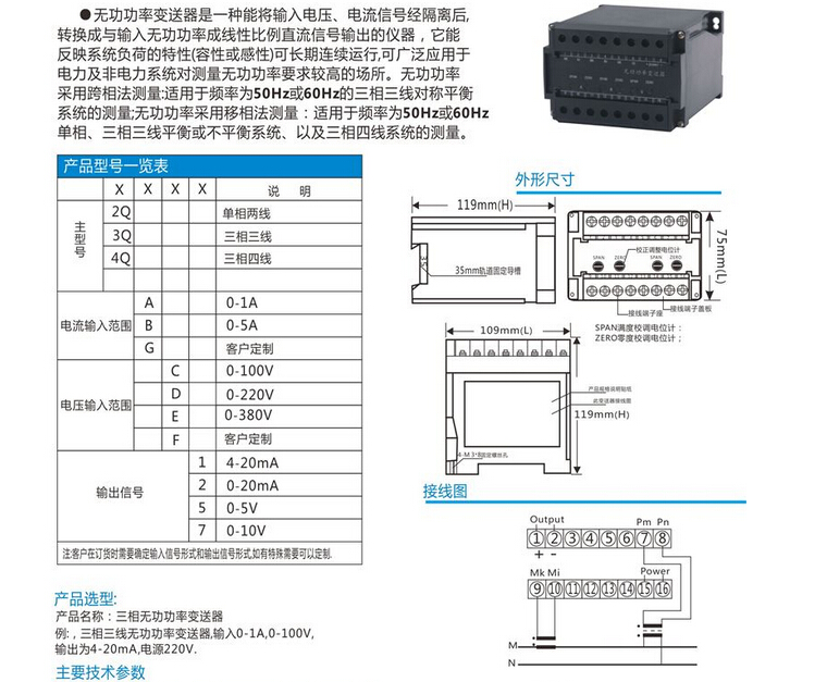 無功功率變送器輸出范圍:DC4-20mA、0-20mA、0-5V、0-10V、1-5V等用戶需要的標(biāo)準(zhǔn)信號